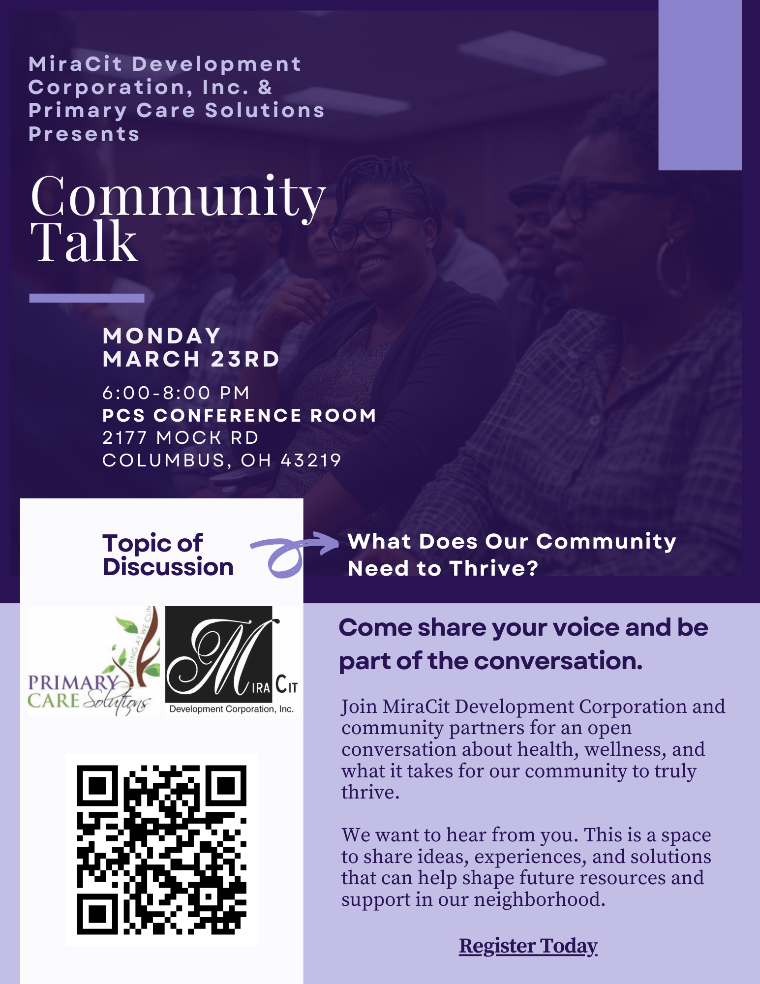 MiraCit Development Corporation and Primary Care Solutions invite community members to join us for an open and honest conversation about what our community needs to be healthy, supported, and thriving.